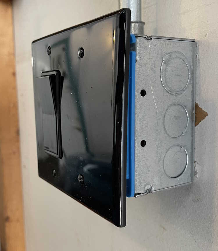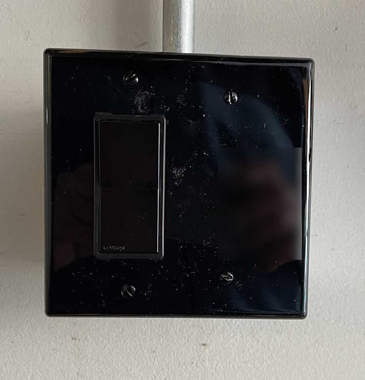 The second PM1 went into a lamp in the garage itself. This is just a wall lamp I put in for some extra light. It’s scheduled to come on and go off at certain times when I have a high probability of being in the garage. This is an on-wall piece of conduit, with a metal box. It originally had a metal plate, so I removed that and replaced with a plastic mud ring and cover. A Decora switch was used because that’s the kind of plate I could get at the time. Like the other unit, this one simply sits to the side of the switch, It faces my local AP, so there’s no signal issue with the metal behind it. You’d never know there was something inside…
