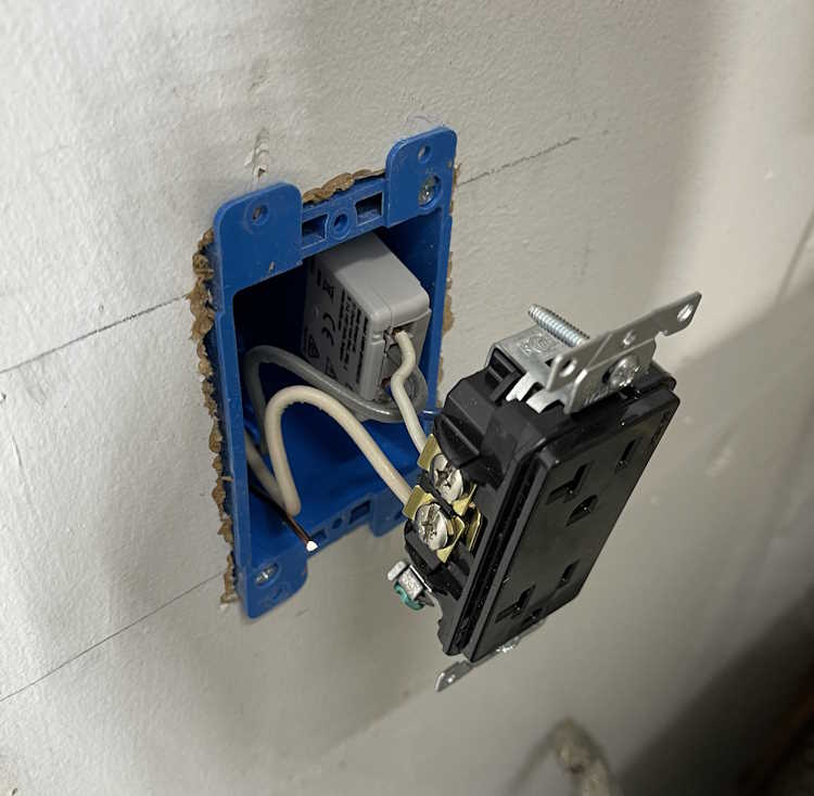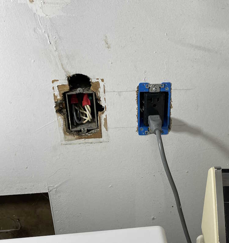 This one looks messy because the previous owner just broke into this box and ran a wire upstairs for an AC unit. You can still see where that was on the wall, and evidenced by the big hole above the box. This line feeds the washer, and some of the kitchen - fortunately they did pick a 20A circuit, but it wasn’t rated for continuous use + kitchen gadgets. I took the time to tidy up the connection so it wasn’t overly cramped in the box. Again, a Decora duplex was used because that’s what I had on hand.