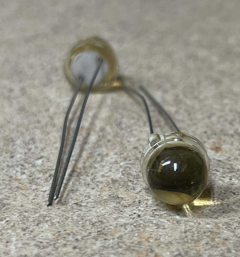 These are tiny solar cells embedded in a plastic bubble, with an output of about 0.5V each - just enough to amplify and detect. I have no idea who made them, or when they were made - the discolored lens suggests they’ve been around for a while, quite possibly the 1970s. There’s no marks or other ID on the plastic housing - perhaps these were made to order and never used?