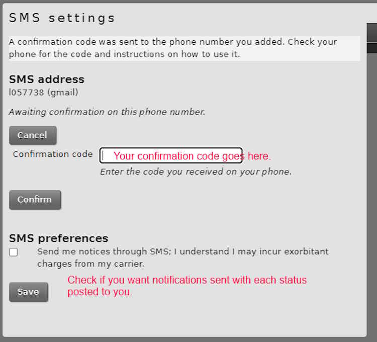 If you did everything correctly, you’ll have an email waiting for you with a confirmation code in it. Paste that in the box, hit “Confirm,” and you’re done. Now you can go back to Connect > SMS and select the “Send me notices” checkbox under “SMS Preferences” to receive a notification every time someone posts to you or on your timeline.