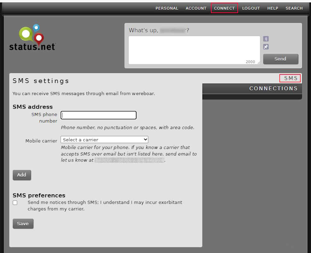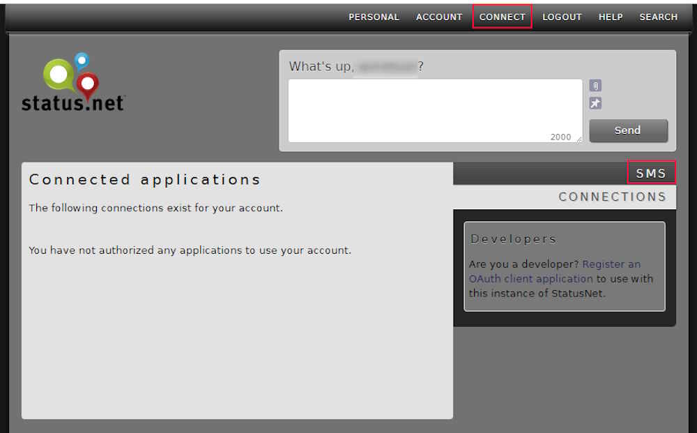 When you are logged in, click Connect at the top. You’ll get a screen showing your connected applications, of which you probably don’t have any. There will be two options to the side, SMS and Connections. Click SMS.