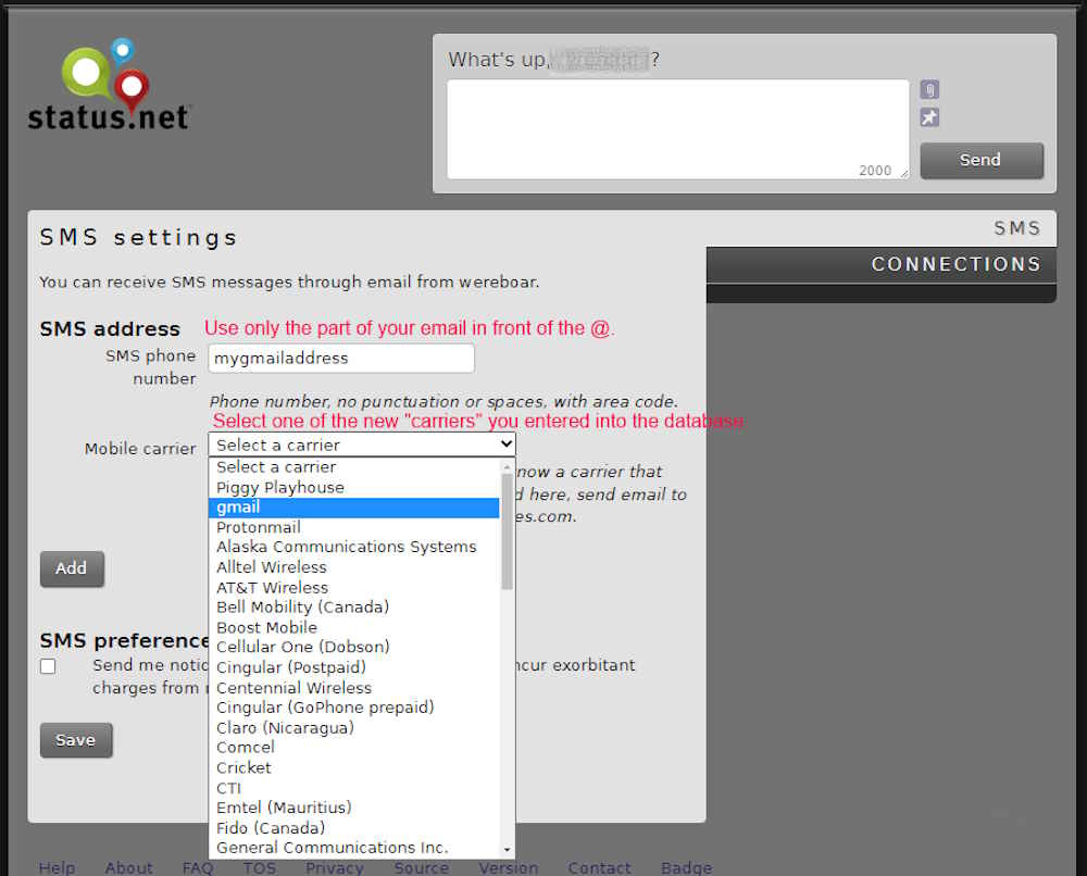 This article is about StatusNet and it’s ability to send a SMS whenever someone posts a status to a timeline you follow. It uses the email gateway provided by most carriers to deliver a message to you - that is, it simply sends an email to “yourphonenumber@yourphonecompany.com.” In theory, anyway. These gateways now have a very suspicious eye when receiving messages containing links or other words that hurt the carrier’s feelings. They’re all but useless these days, and part of that is due to the ease at which spam can be delivered to your phone.