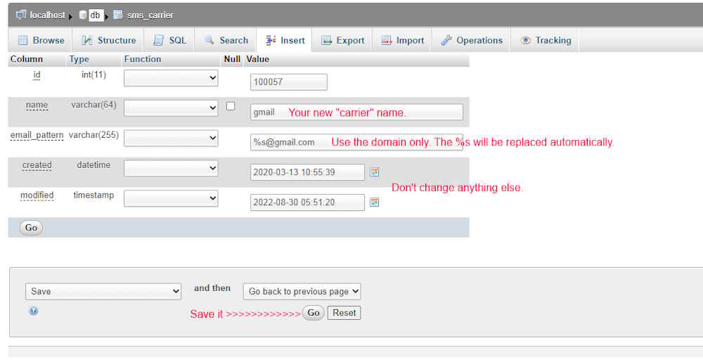 You still want to give it a useful name, and for this example we’ll use “gmail.” Delete what’s in the “name” field under the “Value” column and type “gmail.” In the “email_pattern” field, we need to make sure we give it the proper information. You’ll see something like “%s@phonecompany.com” - replace the “phonecompany.com” with “gmail.com” - you should have “%s@gmail.com.” This will allow StatusNet to fill in the “number” you give it later. Hit “Go” and save your changes, or “Reset” to clear and start over.