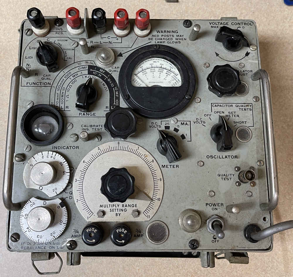 The ZM-11/U - this is an interesting piece of equipment. It’s a fairly precise bridge for checking capacitors and inductors, and uses an eye tube as an aid to the relative quality of the device under test. It’s in pretty good shape physically, a few dents and dings and one broken bail on a clip.
