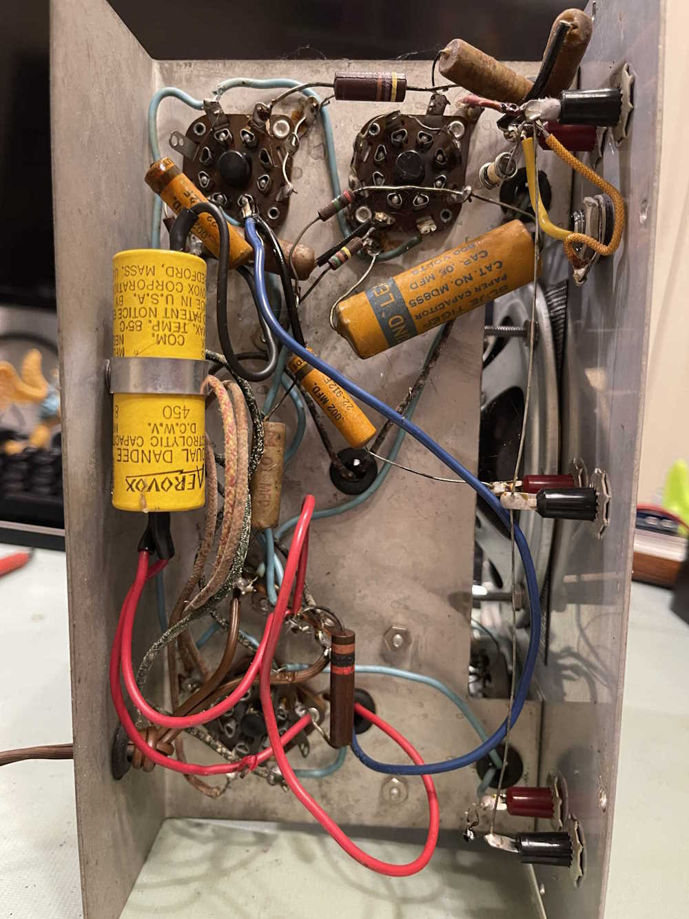 There were some parts just floating around in the chassis, including two wax capacitors for the input. These just went up through the chassis and connected to repaired wires near the function selection switch. They may be original, but have been touched at some point in their life. Note also the across-the-line capacitor (800V 0.05uF) and the added jack for the later RF probe.