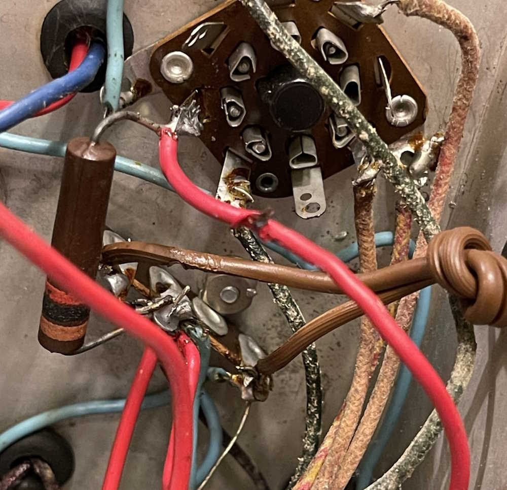 There was some burnt insulation suggesting a soldering iron had been a little careless over the years. That needs to be replaced or covered at some point, but since that’s part of the electrolytic assembly it will probably just get replaced. The electrolytic itself appears to be a replacement, as the soldering job is different (and messier) than the other joints.