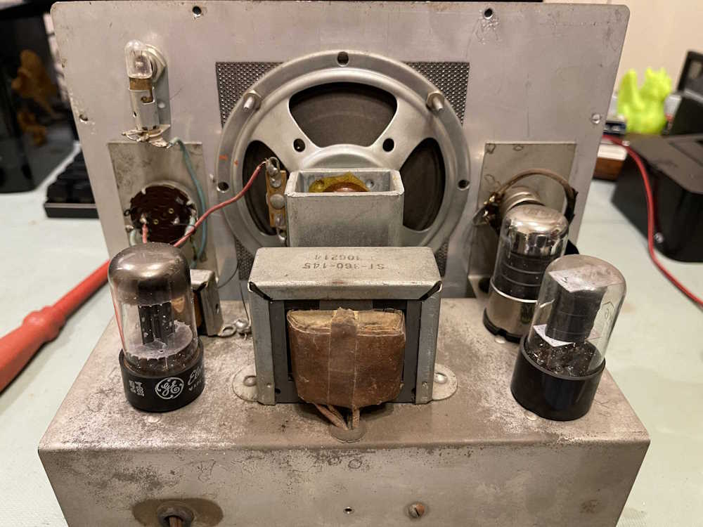 The unit has multiple manufacturers present in the tube lineup, so this thing probably saw a fair bit of use during it’s day. Counterclockwise from the left, it’s GE, RCA, and Sylvania, although the RCA and Sylvania tubes both exhibit the octagonal tube number symbol that indicate they were made by RCA. You can’t trust the label on these things, every manufacturer made things for every other manufacturer!