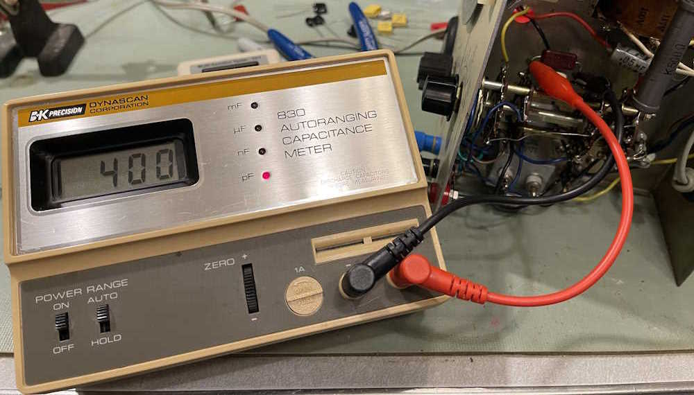The first is the 400pF mica capacitor. I originally thought this thing was a mod, as it has a capacitor and a trimmer. However, I’ve seen another unit under rebuild and it has the same thing. The trimmer itself is plastic, so there’s no way this thing is approaching 600V, but it adjusted down perfectly and I had a good 400pF on the meter.