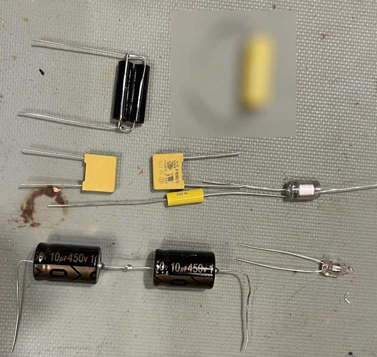What does need to go is all of these metal can parts, especially the across the line capacitors and the filter. For the 40nF capacitor, I chose some 1% film parts at 630V and paralleled two of them for 40nF: