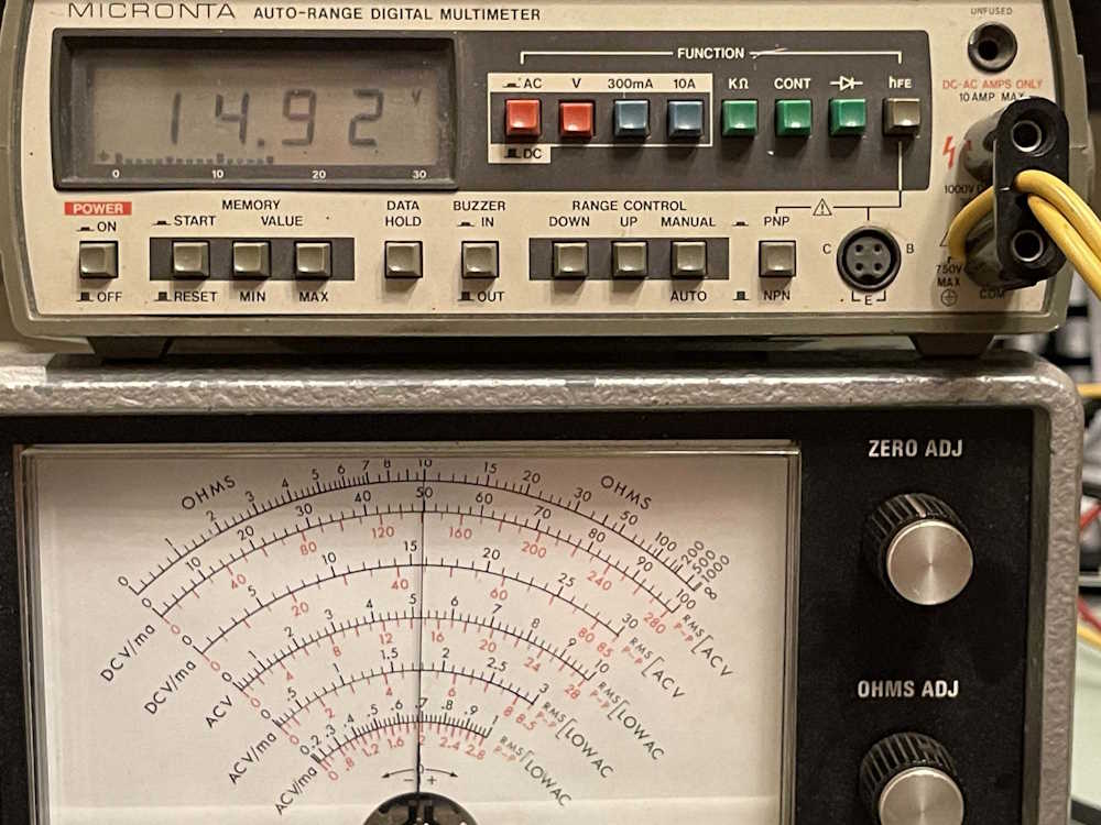 Ohms…that didn’t work. The device stayed on zero and the ohms control did nothing, whereas the zero control slammed the needle to the left. A quick check of the schematic showed something interesting - a 1.5V battery! Turns out this thing NEEDS the 1.5V D-Cell, even when operating off line. I just happened to have one, in it went, and…yep. That works now.
