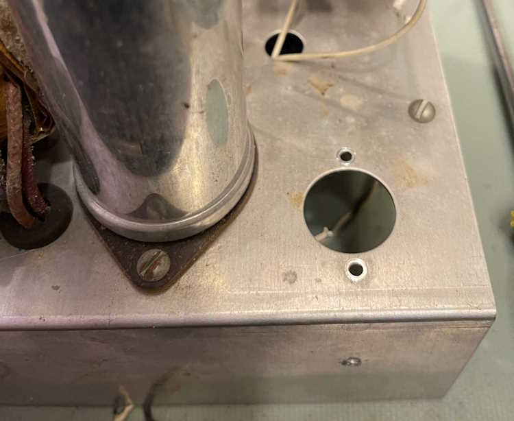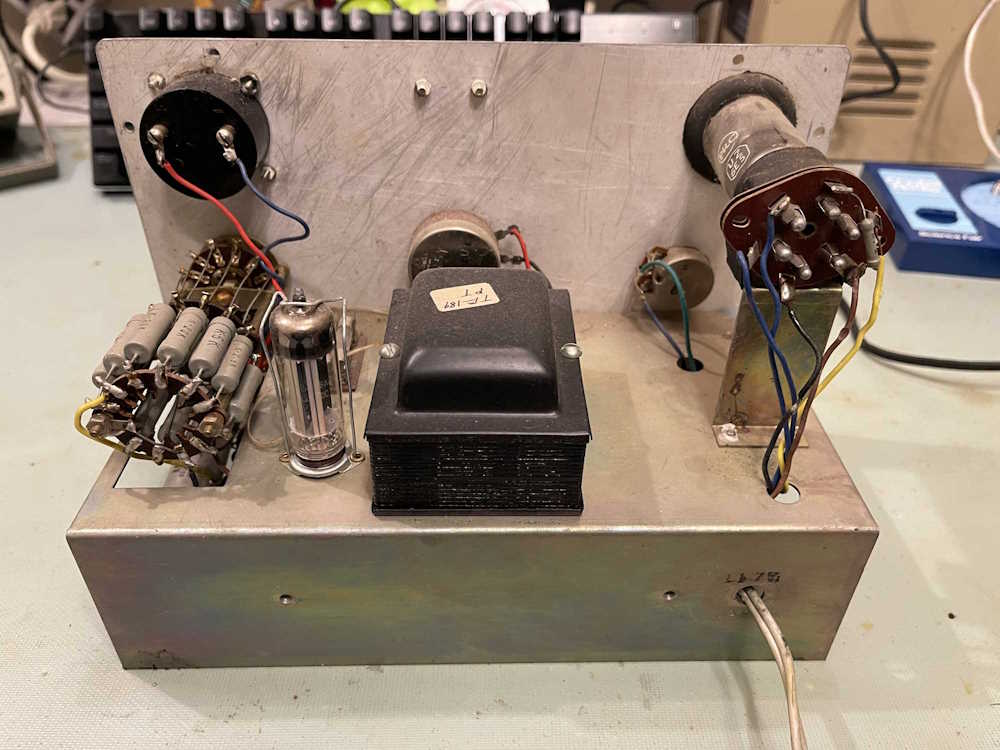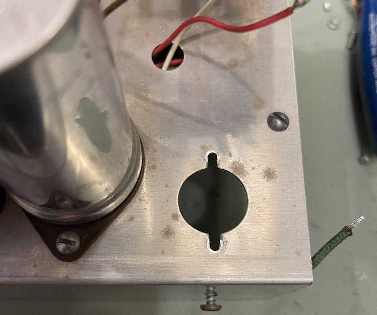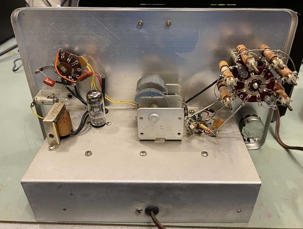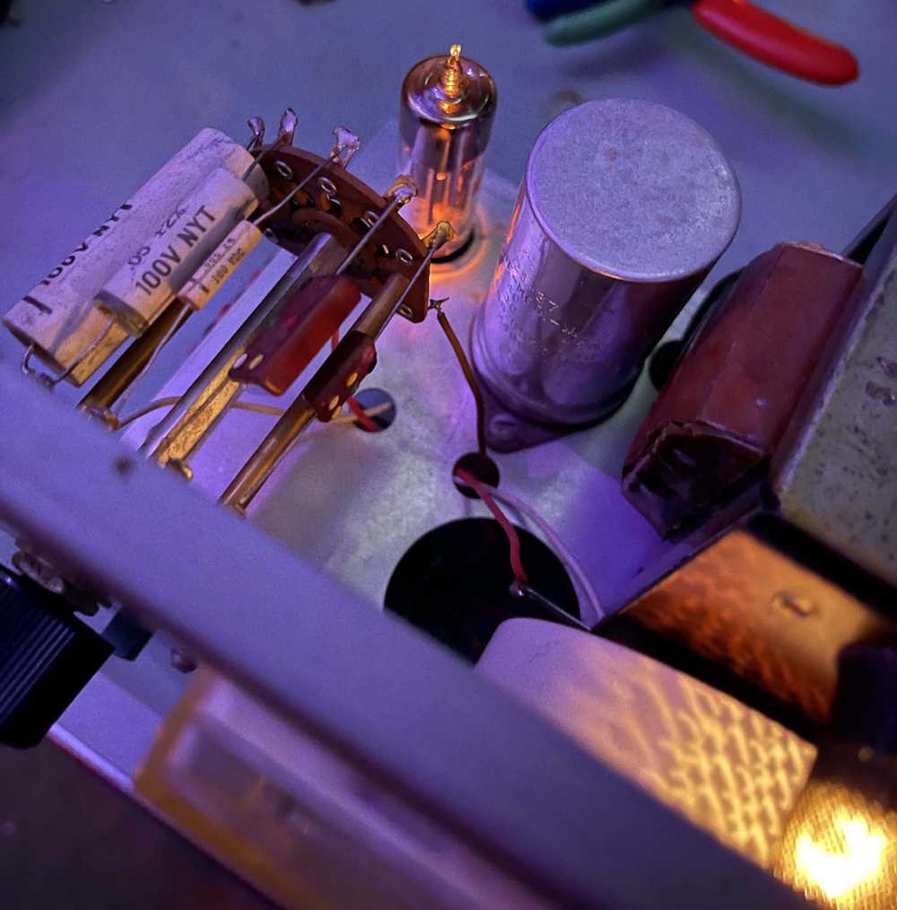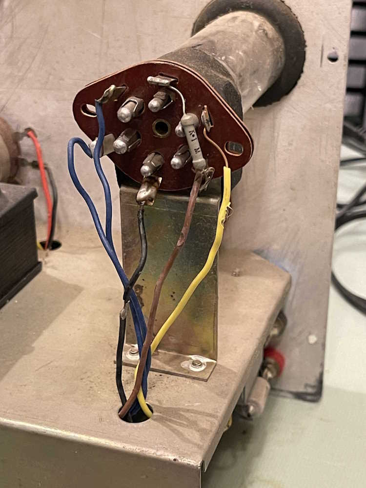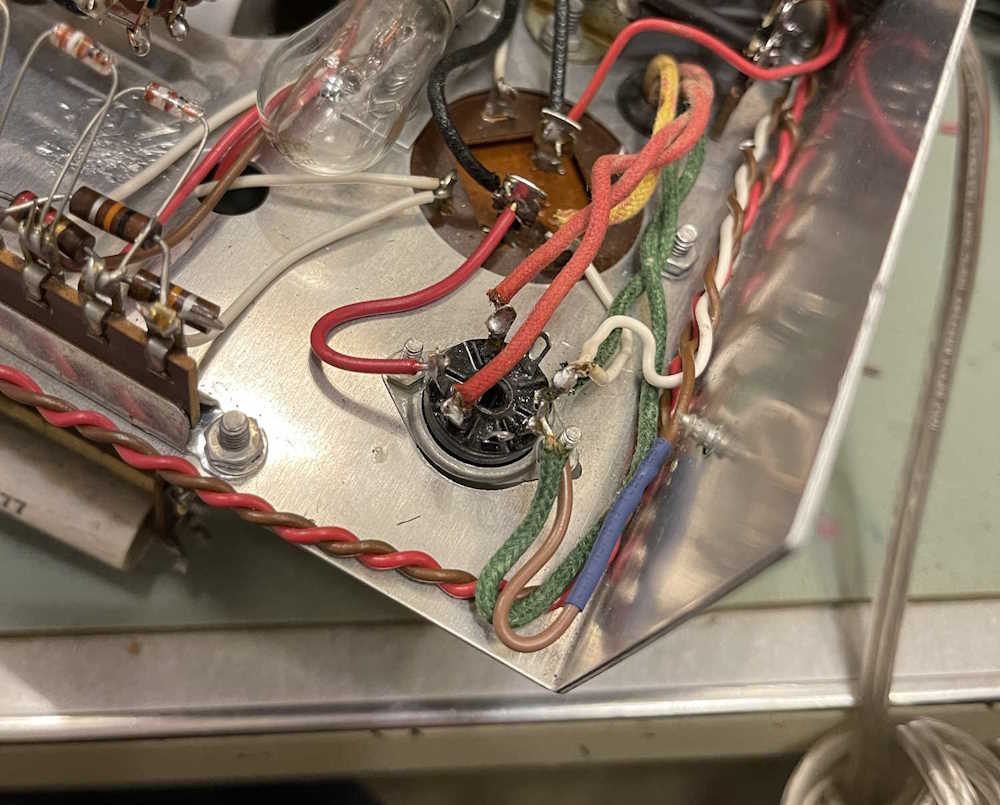 The device does power up, the eye tube is acceptable, but the little neon pilot at the bottom didn’t light. The resistor for this is 50k and the bulb has a domed top, so it’s probably something like an A1C. While this isn’t supposed to be re-lampable, it can be. (Edit: This is relampable. I can’t locate the bulb type, unfortunately.)
