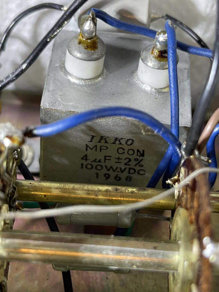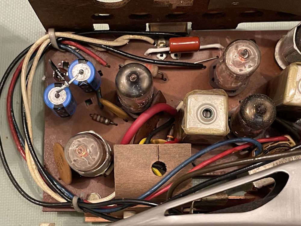 Radio came to me not working, seller said “Won’t warm up.” I think the guy just didn’t know that the power was pull on, not turn on. Plugged it in, and bad filters - the characteristic loud 60Hz buzz said that immediately. The replacements are the two cylinders standing up in the upper right corner. Two 47μF @ 160V replaced the 40/40@150 there previously. That device was dead, high ESR and loss, and cracked potting.