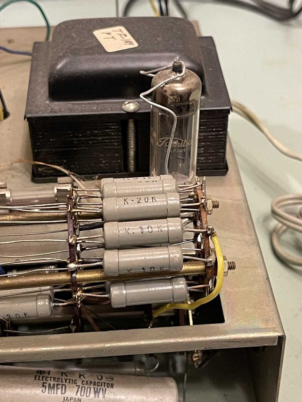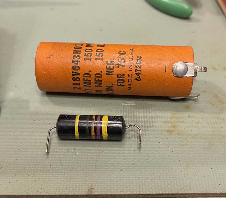Here’s the old parts. The bumblebee measured ok, but I didn’t do leakage. The electrolytic was dead, however. Notice how the leads on the ‘bee are bent weird? That’s how it was in the circuit. Someone hand-inserted the part decades ago and said “eh…good enough!”