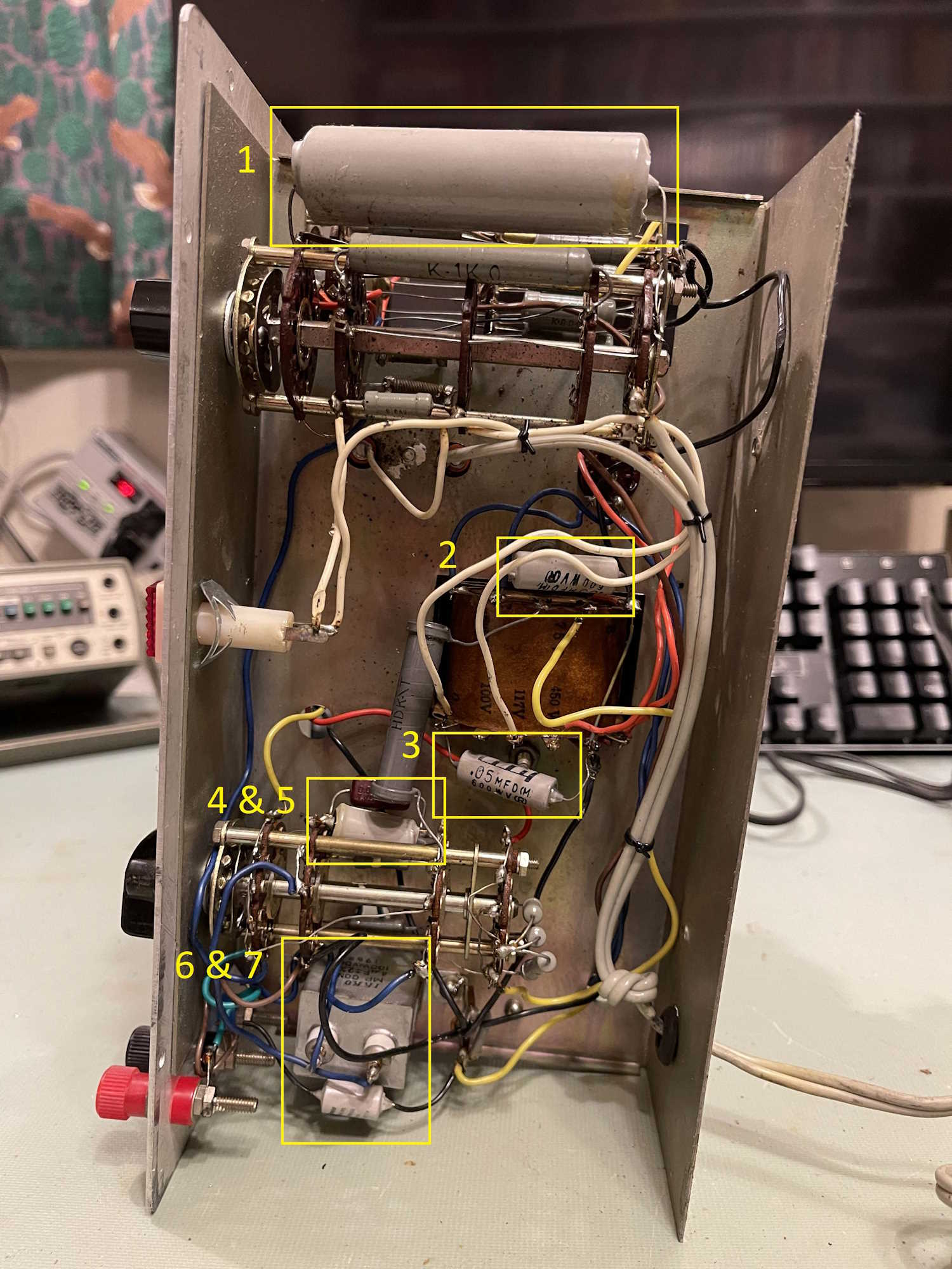 #7 is the odd man out. This is a 4μF at 100WVDC - nothing special you’d think, but it’s in a metal case, almost like a motor capacitor. I’m not sure what the significance of this style of part is. Perhaps it’s a low ESR or has special power factor qualities? It is in the power factor test circuit that gets adjusted on the front panel. More research is in order here, but the part reads 3.76μF in circuit. Assuming it’s a 10% part, it’s still in tolerance. The schematic I have doesn’t say, so…who knows. In another rebuild I saw, this one didn’t get replaced. (no, it’s 2%…odd!)