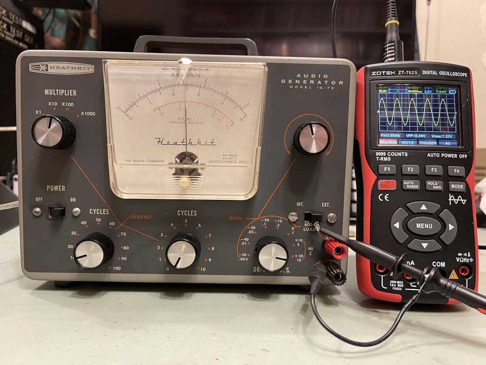 Power was applied and the tubes warmed up. I turned the course attenuator to maximum, and adjusted fine to about 2/5 of max. The unit wasn’t oscillating well, so I turned the oscillator control CCW until I got a sine. I adjusted this until the bottom wasn’t clipped, and then turned it down a bit more.