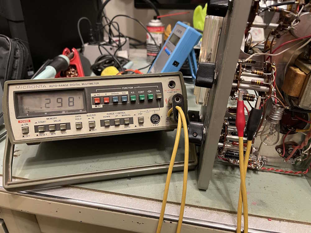 In order to calibrate this, I basically ignored the manual. Since we have DVMs with more than 500 ohms/volt impedance, we can calibrate the device directly. Take note, however, that the device needs to be good and hot before doing this. Let it warm up for a long time to stabilize. I’d suggest taking it out of the case and putting a cardboard box over it. Also note this device was designed to run on 110VAC, so you may need to variac it down a bit.