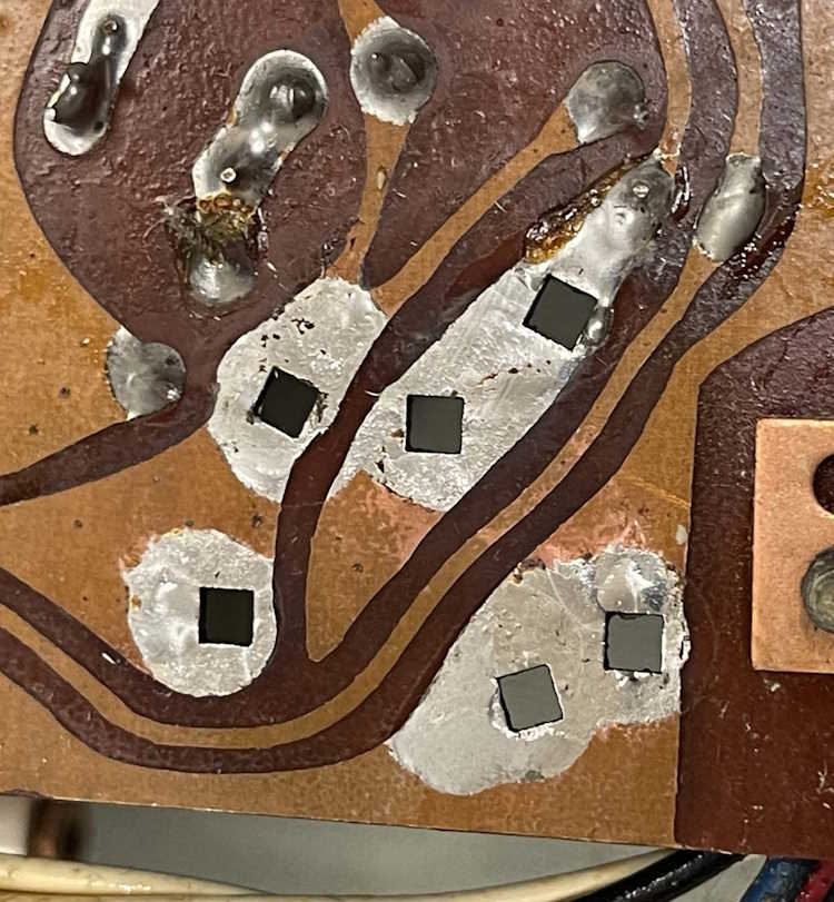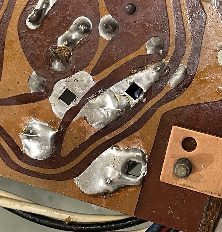 The old solder cleaned up nicely and was removed. Notice there’s multiple holes there, so multiple kinds of parts could be used.
