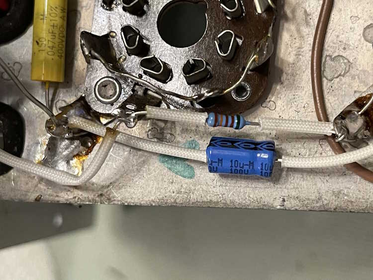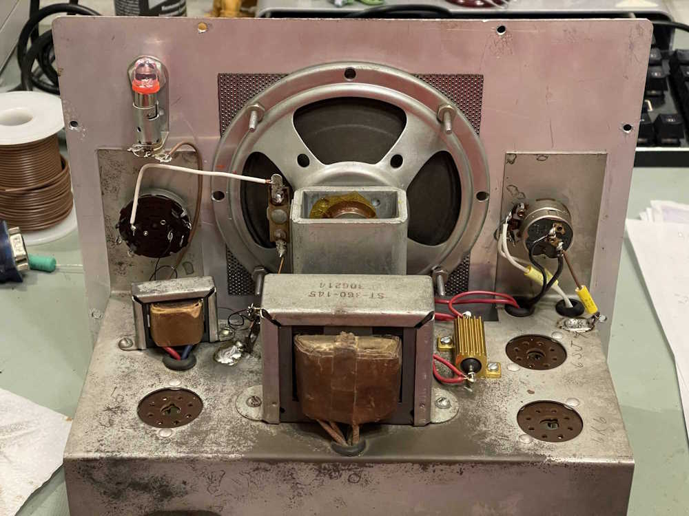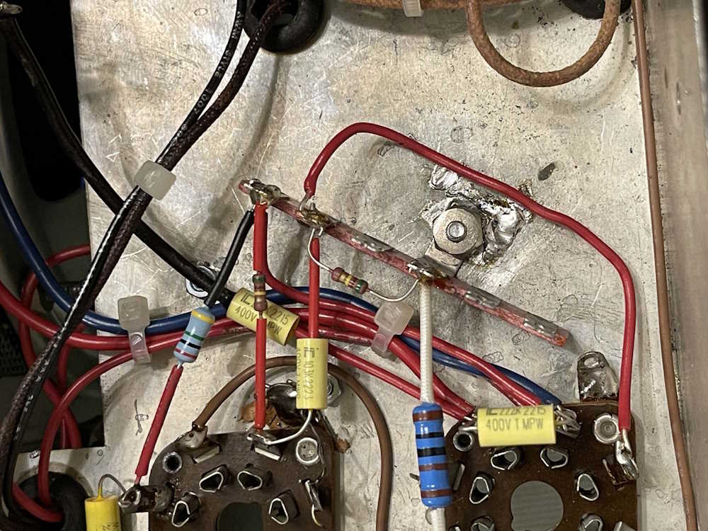 The 6K6 power output tube is run electrically hot in these, about 1W above rated specs according to what I’ve read and calculated. It was suggested that the cathode resistor, R5, be increased from 470ohm to 1kohm. I did so in this rebuild. C10 was missing on my device for some reason, and that was added back in. R5 is the resistor that provides current for the cathode, and C10 is a bypass capacitor to help improve fidelity of the amplified signal. It’s possible that C10 went bad at some point and was removed, as the device will operate just fine without it. I couldn’t see any evidence that it was ever there, however.