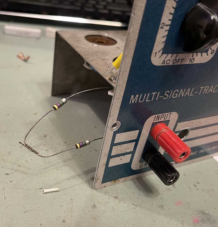 I did put some other resistors in there for testing before I remembered the parts I bought specifically for this unit, specifically these two 4.7M carbon comp resistors that I just stuck out the side. Parts layout is important, as this gave a lot of hum: