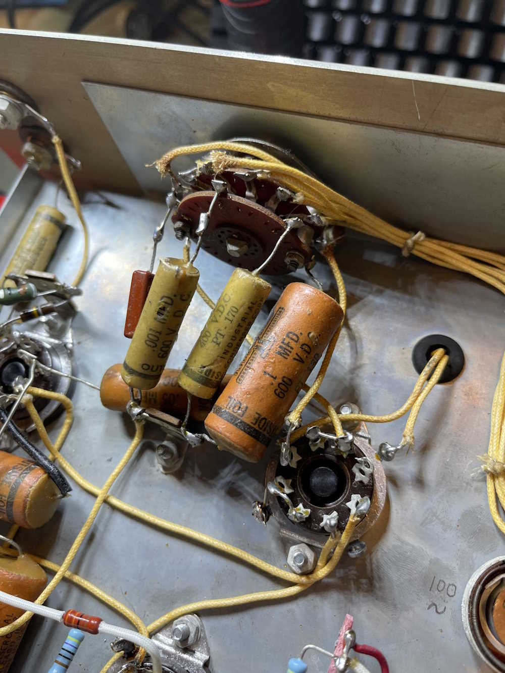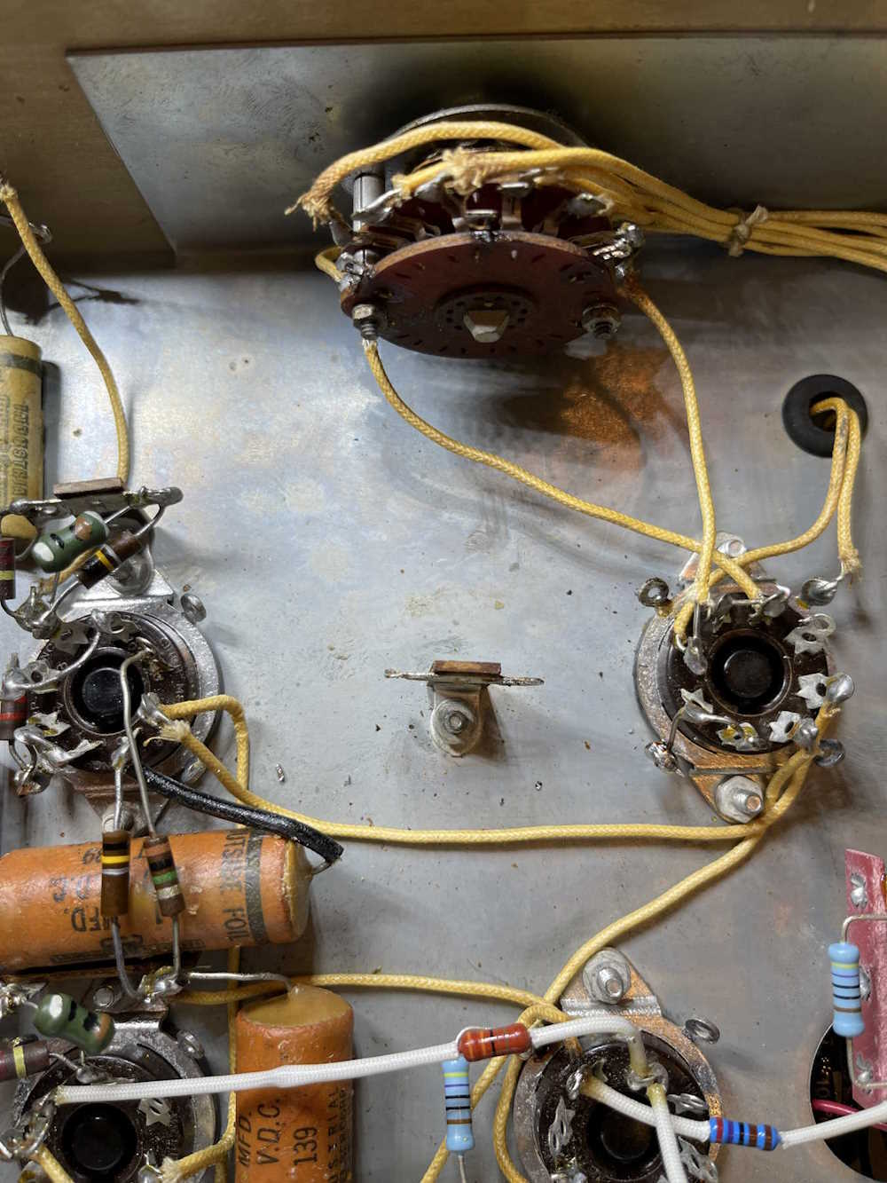 I started by identifying what needs to be replaced. That amounts to 4 capacitors, and one resistor (hidden on the switch.) There’s another capacitor underneath the four I need to replace, since it’s in the way it will get replaced at the same time even though it’s not part of this circuit.