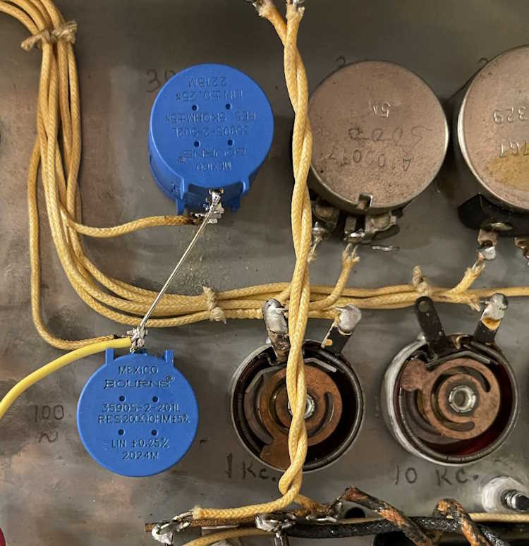 Now that the problem preventing testing has been cleaned up and the business end of the unit has been rebuilt, I went ahead and put two new potentiometers in the unit. Both are 10-turn wirewound 2W units. 200Ω for the 100Hz band and 5kΩ for the 300Hz band - as was in the unit when I received it.