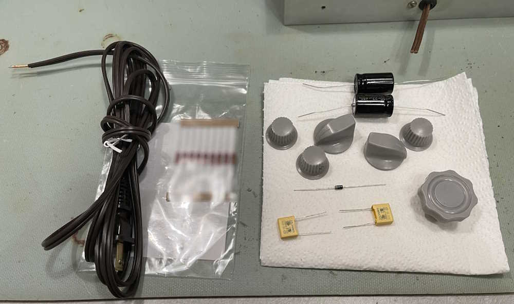 I have some parts already. A new line cord is a must. A diode, some safety capacitors, a couple of filters, and of course all of the freshly cleaned panel knobs. I was going to use some resistors I had in stock, but decided to get something a little different, thus the blurred area. Not going to use those.