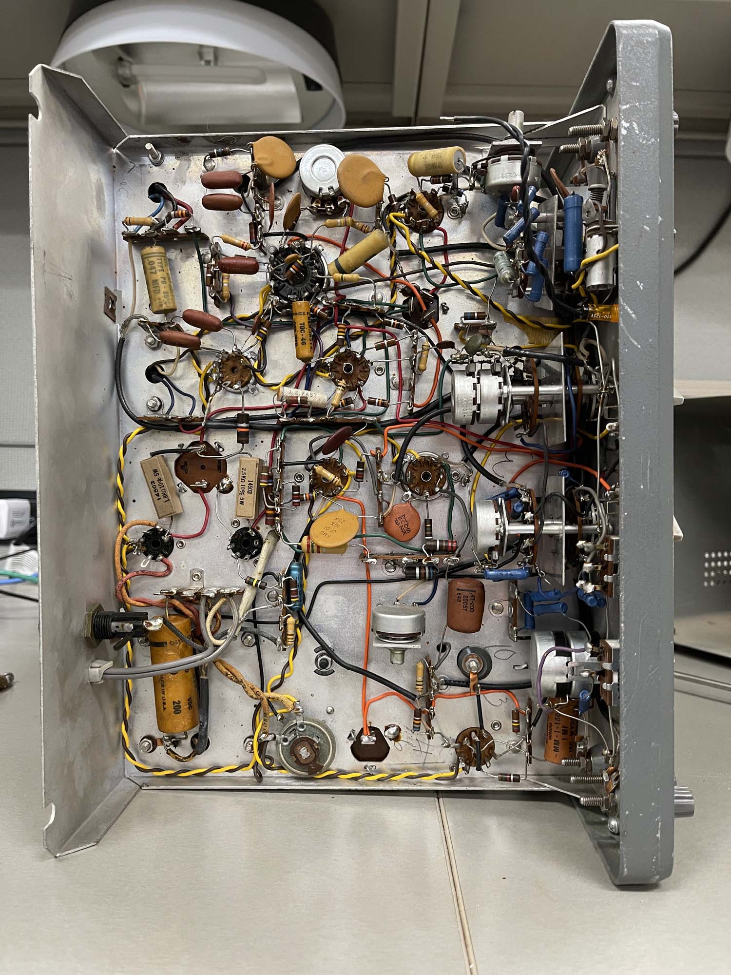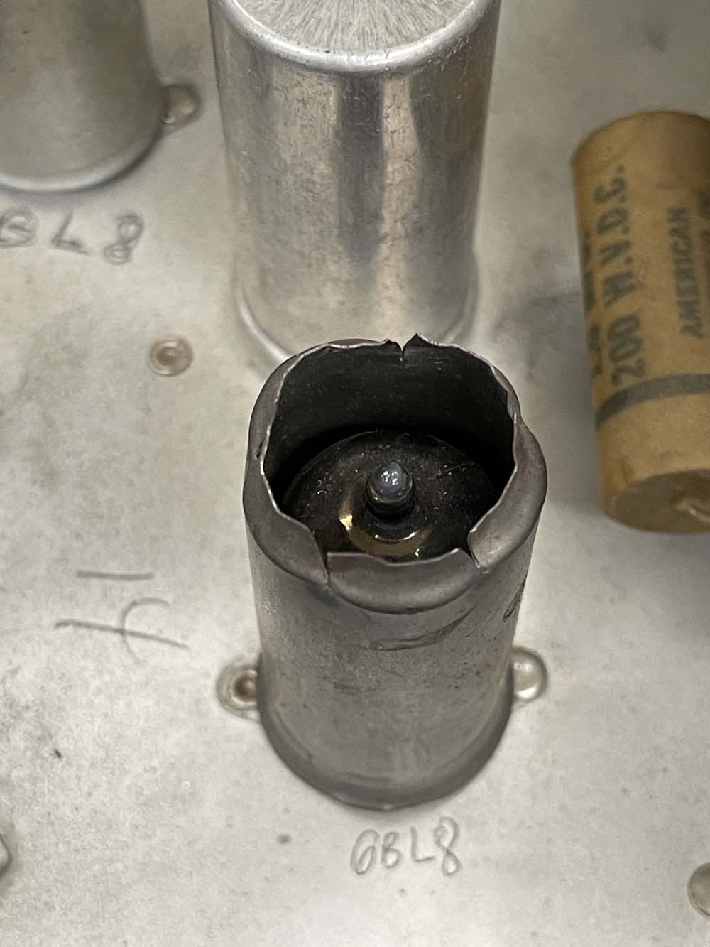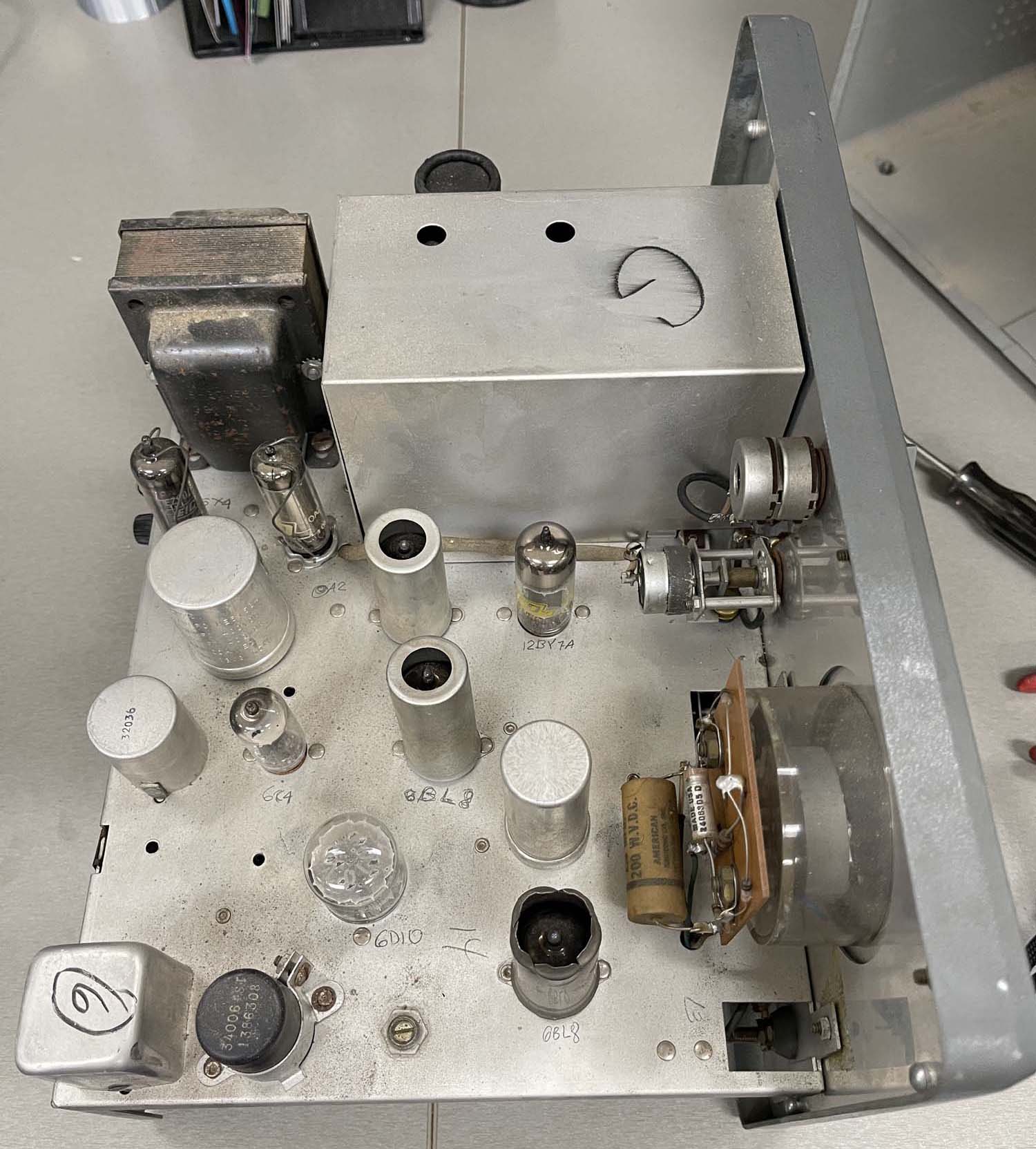 The top has one modification, someone cut open a tube shield. It was suggested that perhaps this tube ran hot and was not operating properly (thus the blackened metal,) and this was an attempt to make it work. Rather crude, and I may see if I can get a new shield and see what happens. If this is indeed an issue, I’ll cut the top to be a bit more clean than this let’s just chop-job it.