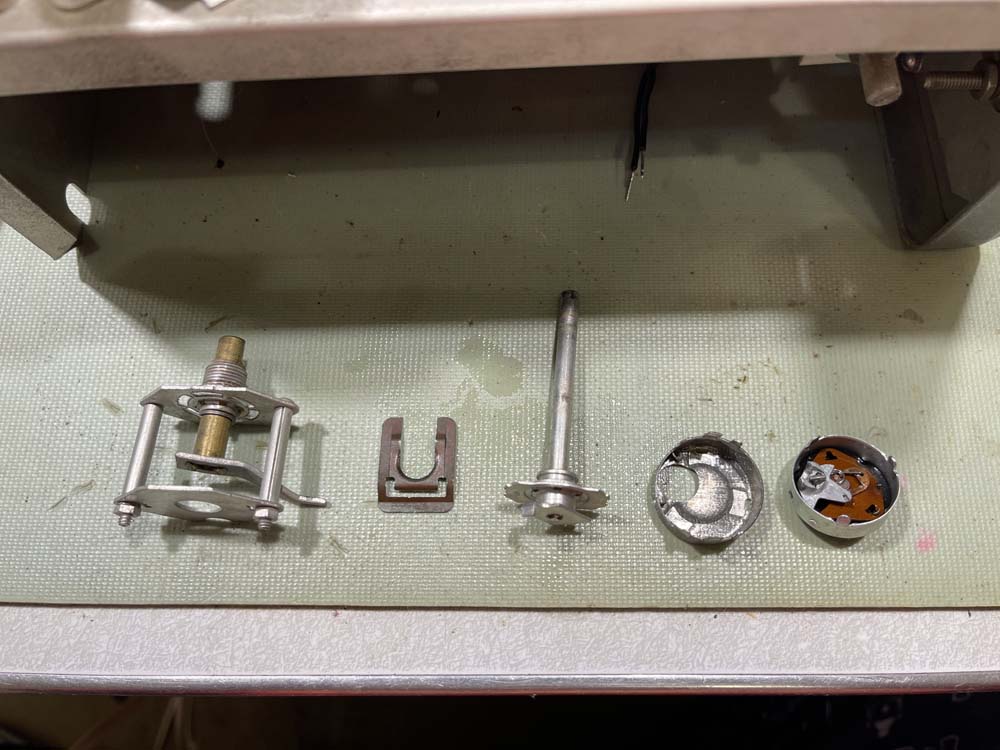 The problem here lies in the final piece on the right. That’s the business end of the power switch, but the actual issue lies under the phenolic wafer. There’s a piece of brass there, and it’s most likely worn from use. I can’t get it out because the switch itself is riveted together. Were this 1970, I would simply purchase that piece - but it’s not. I’ve sprayed and cleaned it the best I can, but it’s not giving me anything but some high-resistance wobble when I move it. Back together it goes. I’m just going to tie the ends of the power cable together and cover them for now. The power switch on the outlet strip will work as it’s power switch for now.