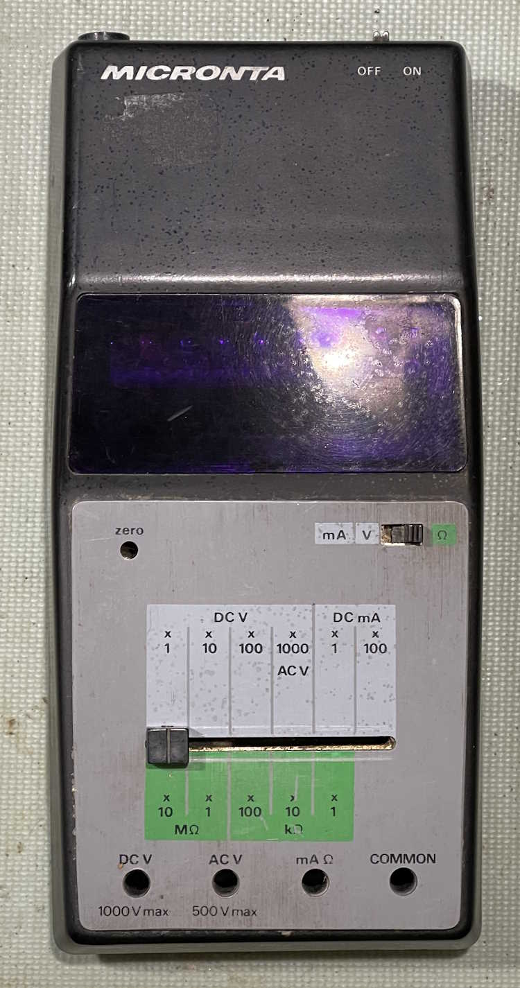 Here’s a couple of devices I’ve picked up at shows and other places, both branded “Micronta.” The first is a small DVM that’s in a calculator-style case with old bubble LED displays. It’s a model as soon as I remember to look at that I’ll put that model number here.