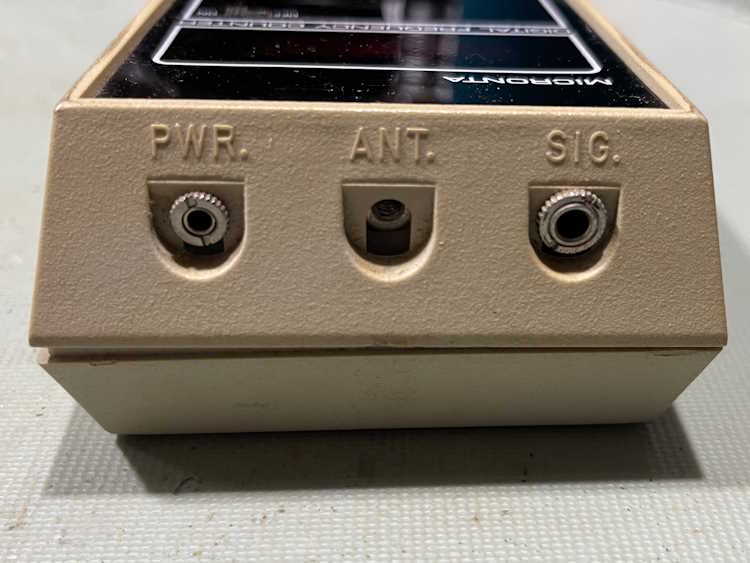 It uses the same 3/32” phone plug for power, has a screw standoff for the antenna, and a 1/4” phone jack for signal input. I have a phone plug on some clips I use for troubleshooting, so let’s slap a battery in and connect it to a signal generator. I give it about 5KHz, which should be well in the range of this device.