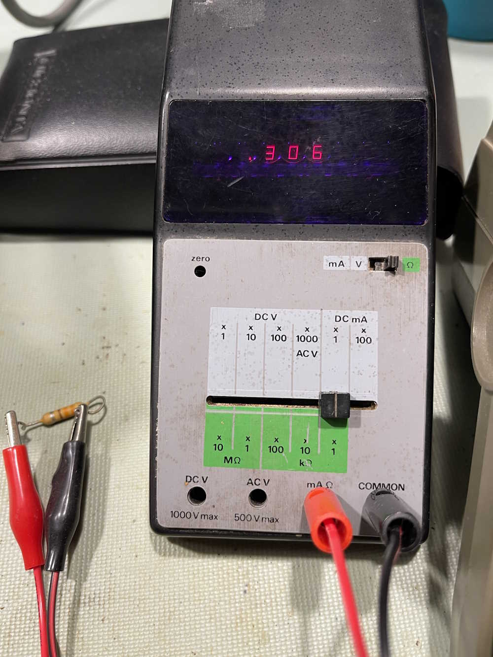 The device’s big brother doesn’t really agree with the measurement. It’s close, however. How about some ohms? Like 330 of them?
