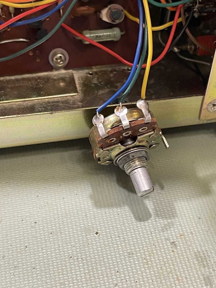 While this one mounts in the hole (it’s a little small) the original knob does not fit on the shaft. I’m going to unsolder the wires on the PCB and run these to it, while mounting the pot in a small hole on the back.