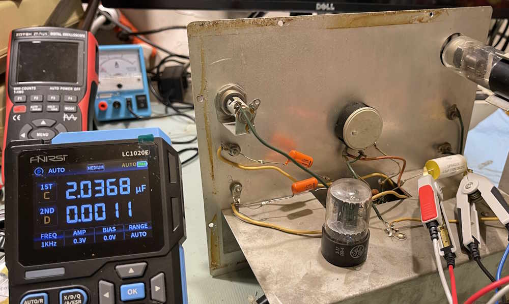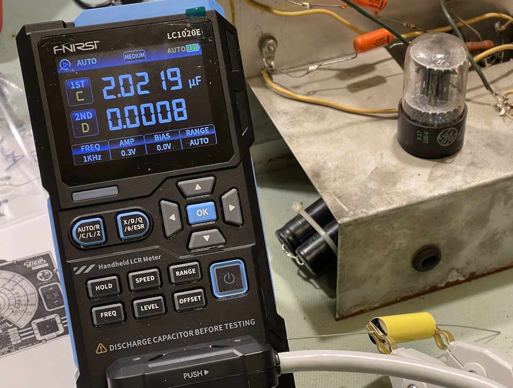 Let’s do a quick test on one of the parts in the unit. This is the main 2.0μF “precision” measurement capacitor, and this one was replaced at some point by the previous owner. Datacode is 70s, but that doesn’t mean anything more than that’s when the part itself was made.