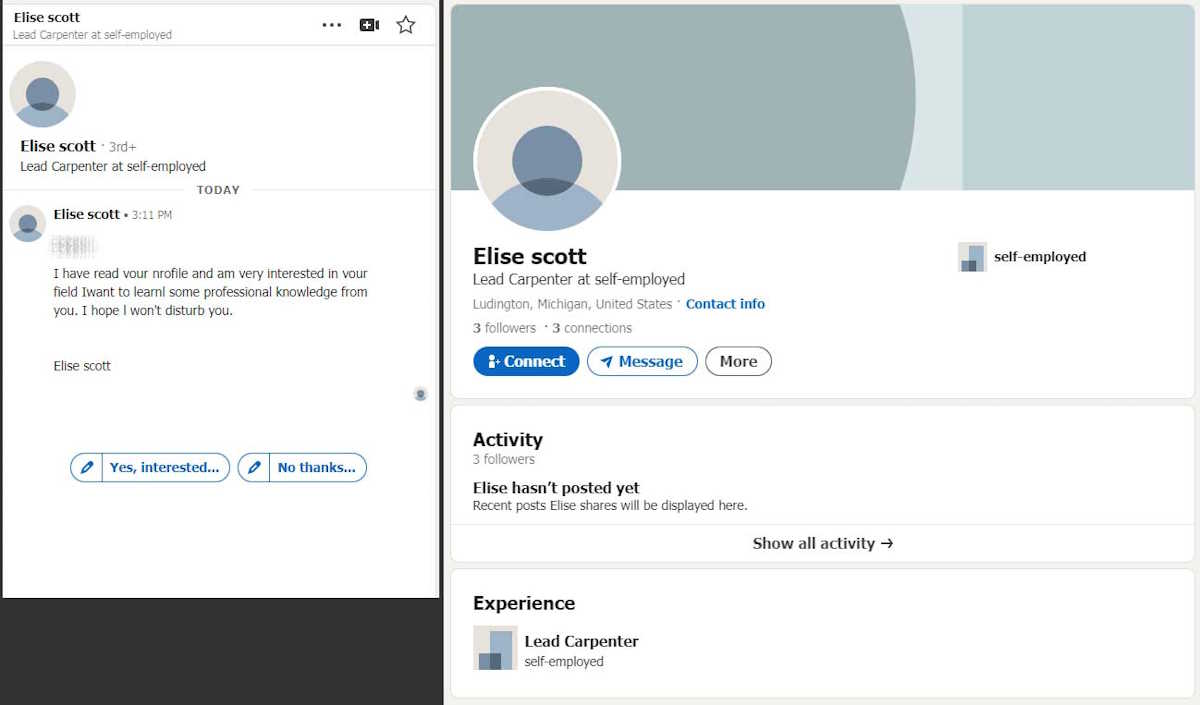 The new one seems to be people who have no profile picture, no jobs listed even though their headline may clearly state multiple job titles that kind of but don’t really relate, and one entry in their history - usually a university from 10 years ago. It’s always “I am very interested in your career and would like to work with you” in the introduction in-mail. Sometimes they have a job, but it’s vague or “self-employed.”