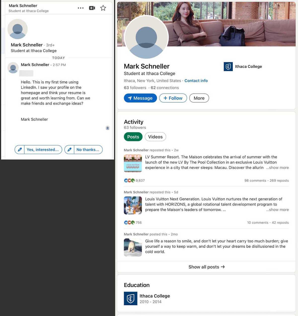 For a while, I was getting these odd connection requests where it was a strange picture and a bunch of unrelated jobs and universities all around the world. The person would always have a job of “shareholder” or somesuch nonsense, and they were always an entrepreneur, and they were a jet-setting, globe-trotting executive that had time to take a wedding dress photo on the beach for their profile. They were also Chinese, even if their photo wasn’t. You could usually reverse search the image and find it on the page the person lifted it from. Nope, right in the bin.