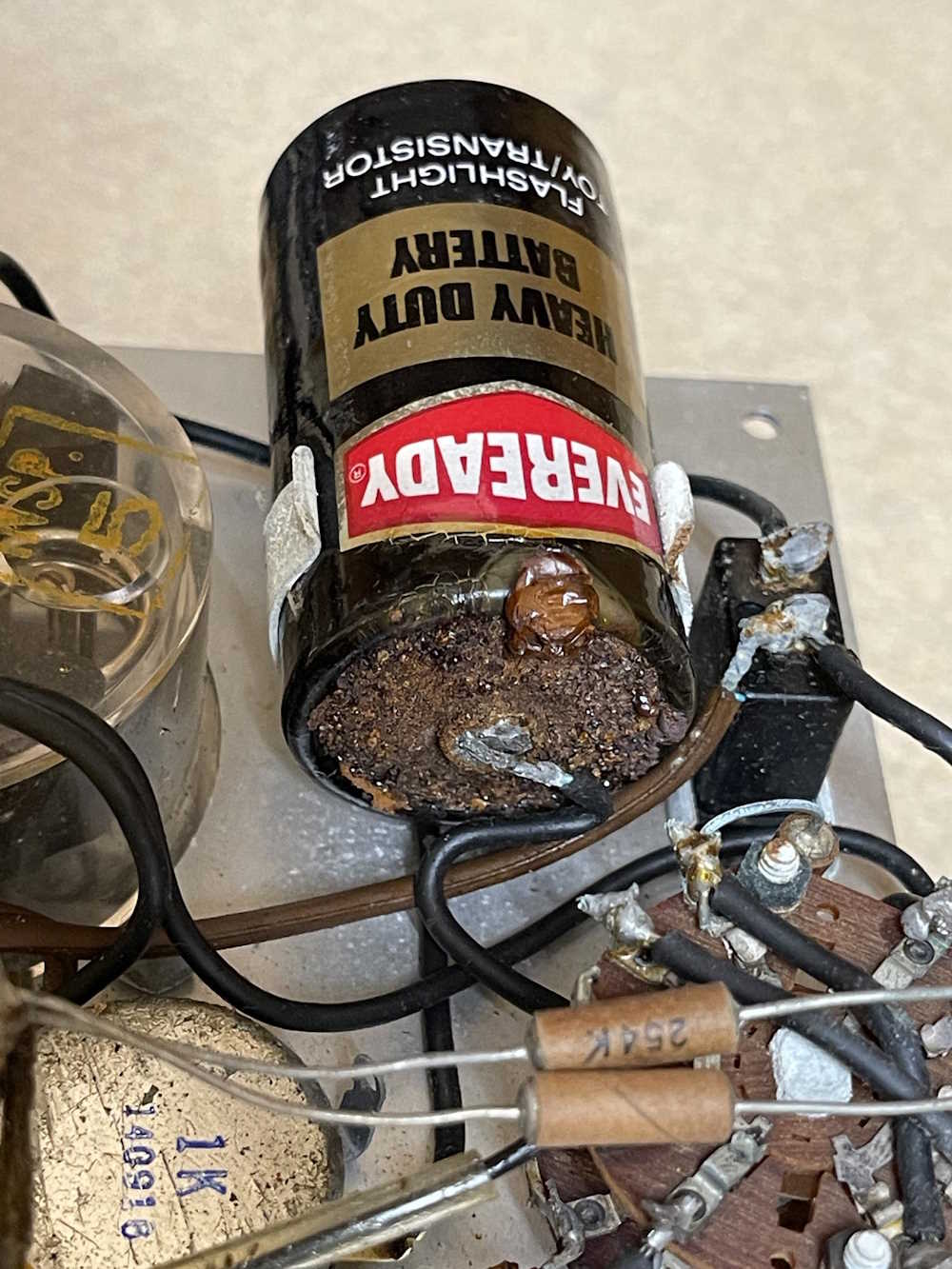 The battery in this one had leaked over the years, but fortunately for me it was a carbon cell. The electrolyte caused oxidation on the battery surface, but there’s no alkaline corrosion mess all over the place.