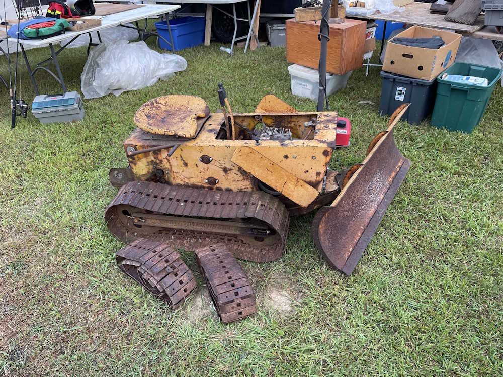 An adorable miniature bulldozer. It’s low, maybe this was for use in a mine? (No, these were sold to the general consumer as a small piece of equipment. There were other attachments for it as well.)