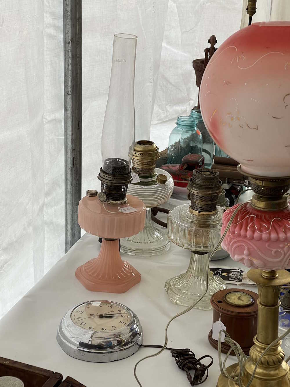 A clear Aladdin Beehive, and a pink and clear Aladdin Corinthian lamp. They were priced appropriately.