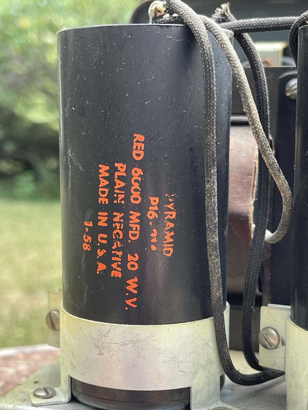 Here’s some boom cans, aka old capacitors. These claim to have been made by Pyramid in 1958. 6000uF at 20V - these can be replaced by 6800@25 for about $4 each, and two of them would fit handily in the space taken by one, with room to spare!