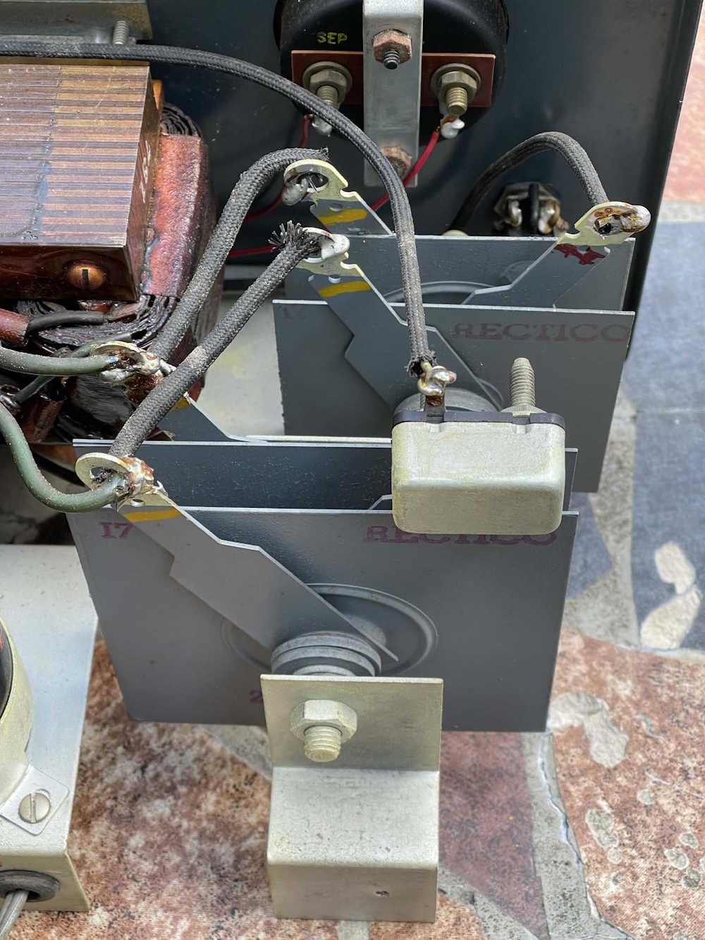 Last, we have the business end of the device. The rectifiers - in this case, giant selenium plates. I wonder what kind of condition these things are in. Are rotten eggs in my future?