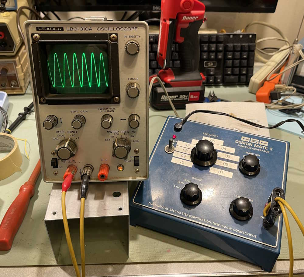 You can see by the sinewave on the scope that it indeed does work. The dial indicator doesn’t match the output at all, so yeah. Whatever. It seems to go from about 7Hz to near 120kHz, with the top clipping a bit when driven hard.