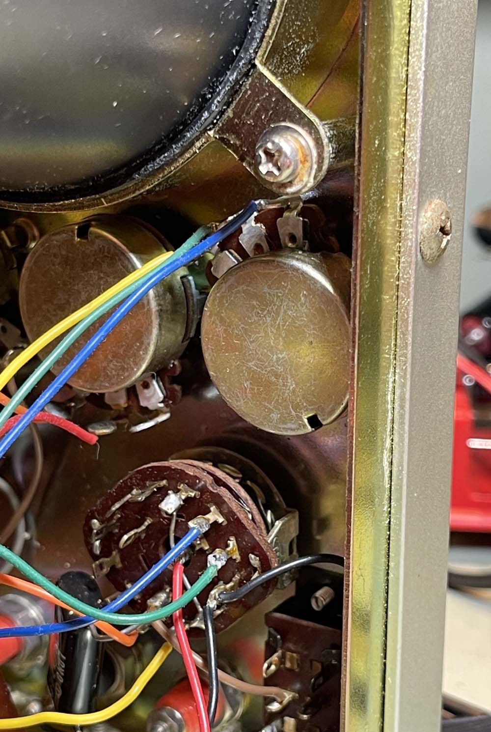 I picked up a few parts, but it turns out this one is just a little different. Older Japanese equipment tended to use potentiometers that were just a bit smaller than the ones we used in the USA. 6mm shafts instead of the 0.250” (6.35mm) that we used, with a correspondingly larger mount. So…the ones I bought won’t fit. I could make them fit, but then the knob won’t fit the shaft.