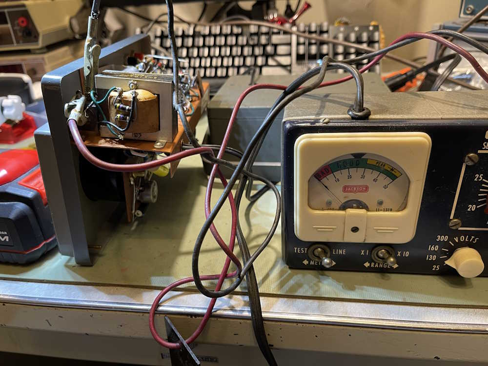 For now, the parts are simply tacked on to their respective tie points, as the meter board will need to come out at some point when the selenium rectifier is replaced. But for now, the meter is ready to test. It does zero now, mostly…it still seems to want to ride just a bit above zero, but it does go to zero, more or less. But there are obviously problems in the divider ladder as evidenced by the readings: