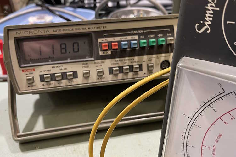 It does work, however, so it’s time to move on to the elephant in the room - the selenium rectifier. In order to replace this with a silicon diode, we need to know the current draw so an appropriately sized dropping resistor can be used in front of the first B+ point. We know that 1mA should be drawn at the second B+ point, so we could probably assume that similar will be drawn from the first B+ point, for a total of 2mA. First thing to do, however, is measure the output on the transformer. It looks like about a 1:1 output, as I have 118VAC on the secondary.