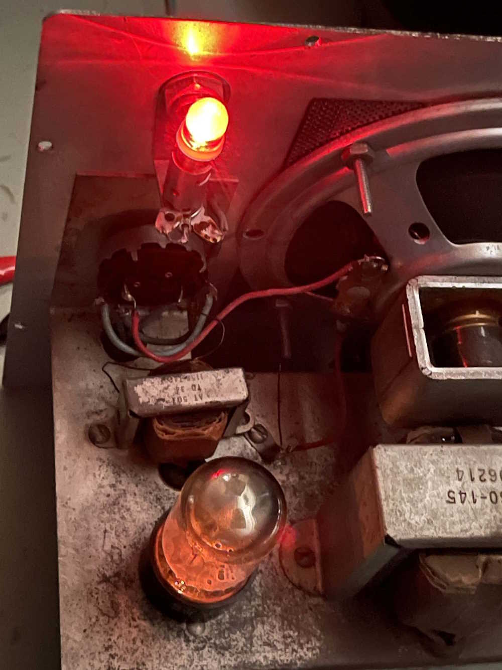This is a cheap replacement for a not really but getting more expensive incandescent #44/#47 style bulb. Originally made for pinball machines and other amusement vending devices, these seem to work fine in other equipment. The ratio of metal to “glass” is a bit different, so the glass portion doesn’t really line up as well with the jewel in my application. However, it works well enough and hopefully takes just a bit of load off the old transformer. Maybe it will last a bit longer that way.