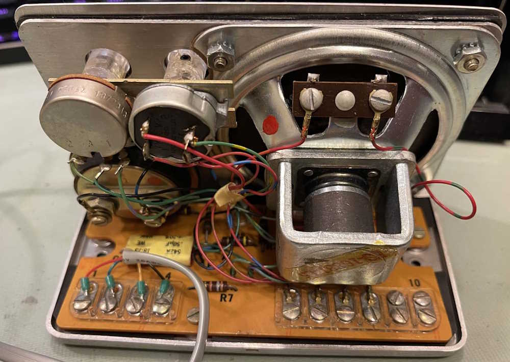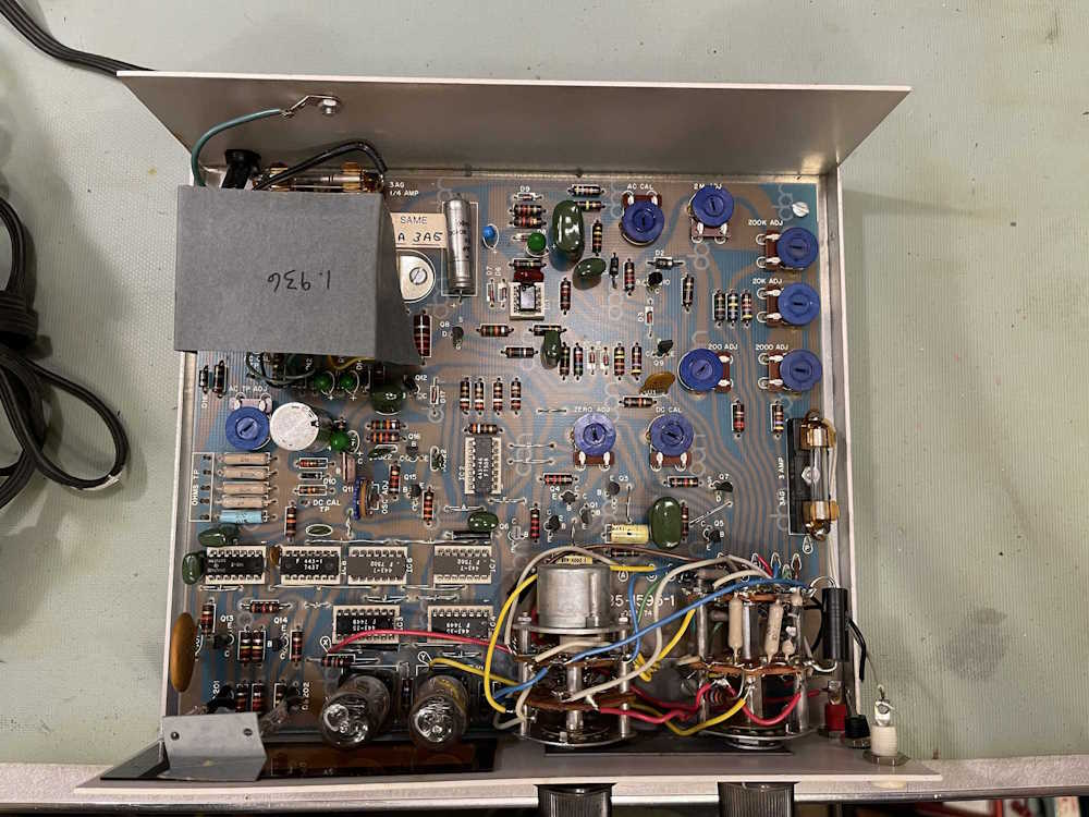 Time to open the top cover. Notice the line of big beige resistors on the left and the one blue specimen at the bottom? These are calibration resistors, and one had apparently broken at some point, as the rattle was the remains of an old part. The original owner hadn’t removed the debris for some reason.