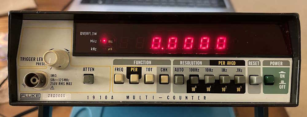 So I set up, and…the Fluke counter doesn’t work. It will work as an up-counter, but won’t count frequency input. Hitting the “CHK” button, I get nothing:
