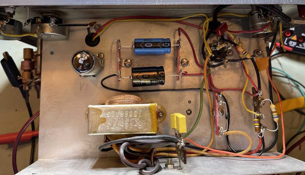 I think I know what’s going on here, and it’s related to the rectifier type of the circuit. A solid-state device performs differently than a tube device, and the OEM took advantage of old part characteristics when designing the unit. I changed the 47μF with another 22μF @ 450WVDC part, applied power, and…