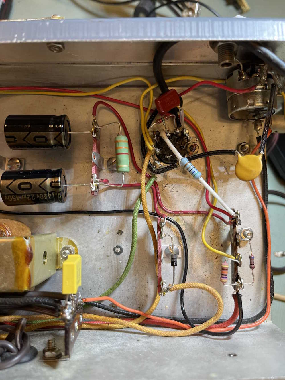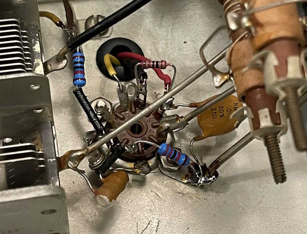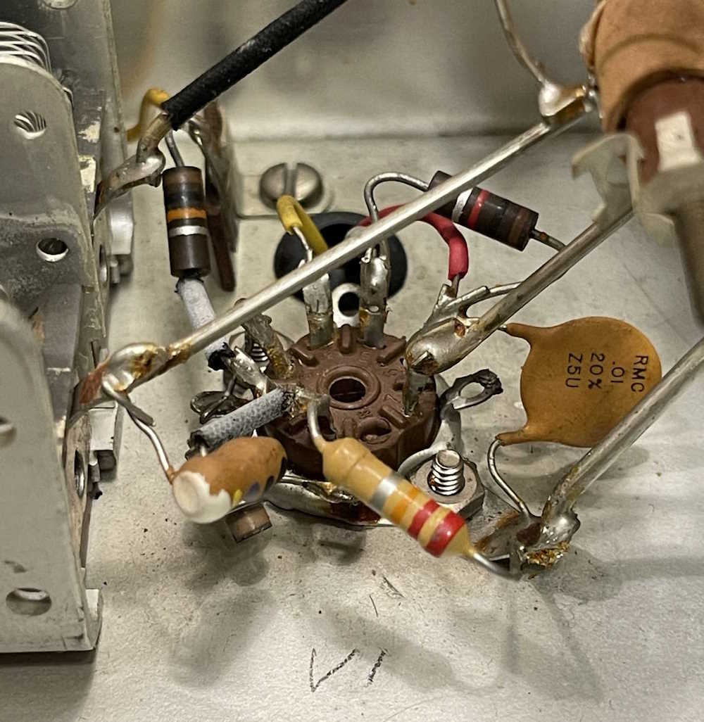 The chassis shows some signs of work over the years. J-hooked parts show someone probably did some investigative repairs, and that resistor pair that’s tied together certainly wasn’t factory…