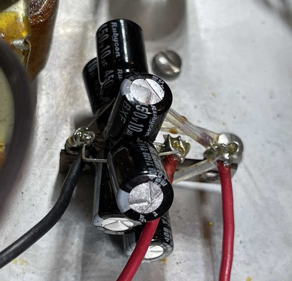 I understand the person probably used what they had on hand, but still. This is kind of sloppy, but it worked. Note that the capacitors are 450WVDC…